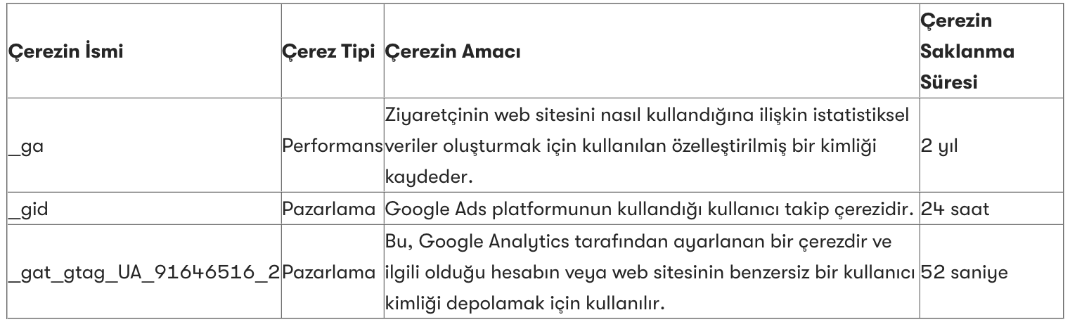 - 5) Performans ve Analiz ÇerezleriBu çerezler sayesinde sitemizi kullanımınızı ve sitemizin performansını analiz ederek sizlere verdiğimiz hizmetleri daha iyi hale getirebiliyoruz. Örneğin bu çerezler sayesinde ziyaretçilerimizin en çok hangi sayfaları görüntülediğini, sitemizin gerektiği gibi çalışıp çalışmadığını ve olası problemleri tespit edebiliyoruz.
